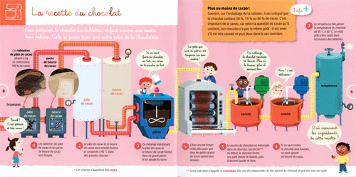 J’ai été surprise par l’ordre des explications. On passe de comment on réalise une tablette de chocolat, à comment on fait le chocolat à comment on créé de la pâte, du beurre et poudre cacao. Puis après deux pages sur la fève de cacao on va à la rencontre d’un chocolatier qui réalise entre autre des chocolats de pâques. Avant de terminer, on nous montre des exemples de ce que l’on peut faire avec du chocolat et au final, une recette pour réaliser ces oeufs de Pâques. Je n’ai pas trop vu l’intérêt de ne pas mettre un ordre en partant de la fève. Le contenu est pourtant au rendez-vous.