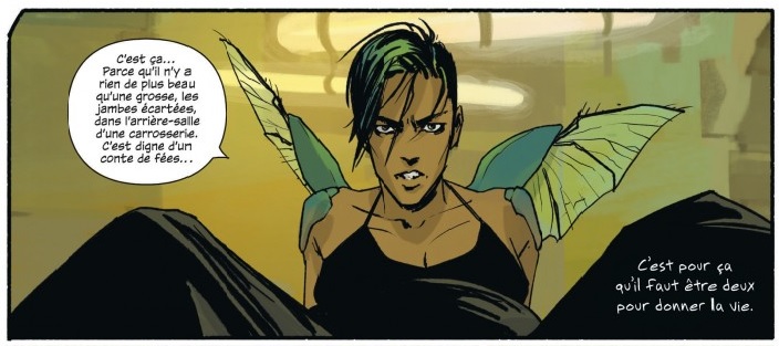 L’écriture de Brian K. Vaughan sonne très juste sans ne jamais faire aucune fausse note. Les personnages semblent très vraisemblable dans leur caractère, leur impulsion, leur valeur. On retrouve même des scènes de ménages et de jalousie. Ils se disputent par exemple pour trouver un prénom à ce bébé. Comment concilier les croyances de chacun lorsqu’il y a un acte de mutilation pour aider la pousse des ailes ? Faut-il choisir la nounou même si c’est un fantôme qui ne peut apparaître que la nuit ? Pleins de discussions qui demandent de la conciliation même si la tranquillité n’est jamais permise.