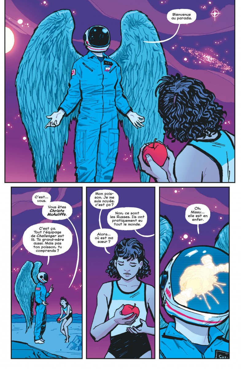 Ce premier tome français recueille les 5 premiers chapitres de la série publiée aux Etats-Unis chez Image Comics. L’ensemble se lit très vite car j’ai déjà envie d’avoir tellement de réponses à toutes les questions qui se posent face à ce début d’histoire palpitante. Il faut dire que la personnalité des quatre filles est vraiment bien travaillée avec justesse et vraisemblance. Je me suis attachée à ces gamines et j’ai envie de savoir ce qu’il va leur arriver. Brian K. Vaughan est un vrai pro du scenario. Il m’a déjà conquise avec Saga alors il n’y a pas de raison que sa magie n’opère pas avec cette série également. En plus les dessins de Cliff Chiang sont extrêmement précis et se rapproche presque de la bande dessinée européenne. Le tout mis en couleur Matt Wilson avec des couleurs superbes surtout le fameux ciel rose lorsque les filles sortent du sous-sol. Un trio qui forme une équipe de choc.