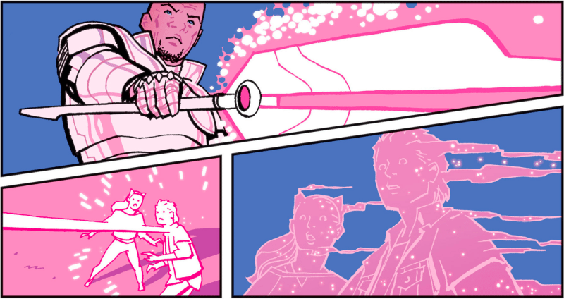 C’est par grande de deux qu’elles vont réaliser leur tournée. Mais très vite, les filles vont se faire voler un des talkies-walkies. Pas question de se laisser par des garçons qui se croient plus malins. Ensemble, elles vont remonter la piste d’où ils auraient bien pu se planquer. Ils sont entrés dans cette maison un peu étrange. Voilà qu’au sous-sol, elles vont faire une étrange découverte. Une machine qui pourrait être liée au canular de la Guerre des mondes. De nombreuses questions viennent alors se poser. Et elles vont devenir encore plus nombreuses quand un éclair rose va les éblouir et les toucher.
