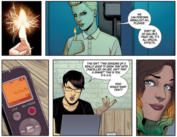 Par exemple, Lucifer, qui est une femme est accusé d’avoir tué des gens d’un claquement de doigts puis c’est au juge de mourir ainsi. Elle est reconnaissable car elle porte le costume de David Bowie dans sa période Thin White Duke. Sakmet et Baal ressemble de très prêt à Rihanna et Kanye West. Odin porte un casque des Daft Punk. On a furieusement envie de musique en suivant les turpides de ces divinités qui ne sont pas si tendres et si gentilles. Il y aurait sur Spotify une BO idéale à écouter.