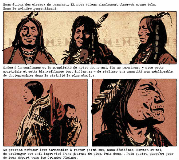 C’est un très beau récit de voyage que nous propose Thierry Murrat. J’ai eu un peu de mal au début à rentrer dans son univers graphique avec les aplats noirs et sépia. Puis très vite, je me suis plongée dans cette rencontre avec Joseph Wallace et le changement de sa vision du monde. Cet homme modeste et simple, est devenu un photographe naturaliste et humaniste. L’évolution de son regard évolue de page en page grâce aux rencontres avec les indiens. Et surtout grâce à Hermann Greenstone qui lui a donné à ces débuts des cartes pour mieux comprendre leur culture. Son envie de retrouver des tribus et de les prendre en photographie devient de plus en plus imposante. Le dessinateur nous le montre par le biais d’échanges épistolaires entre les deux amis.