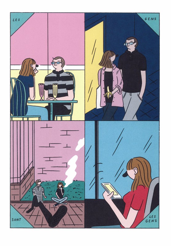 Il bien difficile de parler d’une bande dessinée qui n’a aucune histoire. Juste quelques instantanés où il ne se passe rien ou pas grand chose. Il faut alors faire preuve d’imagination et abandonner toutes ces certitudes. C’est plus vers le côté graphique très épuré et très coloré, qu’il faut se plonger. Les personnages n’ont pas de yeux. Les plans se mélangent pour créer des ruptures visuelles. On pourrait classer cette bd dans une catégorie inclassifiable.