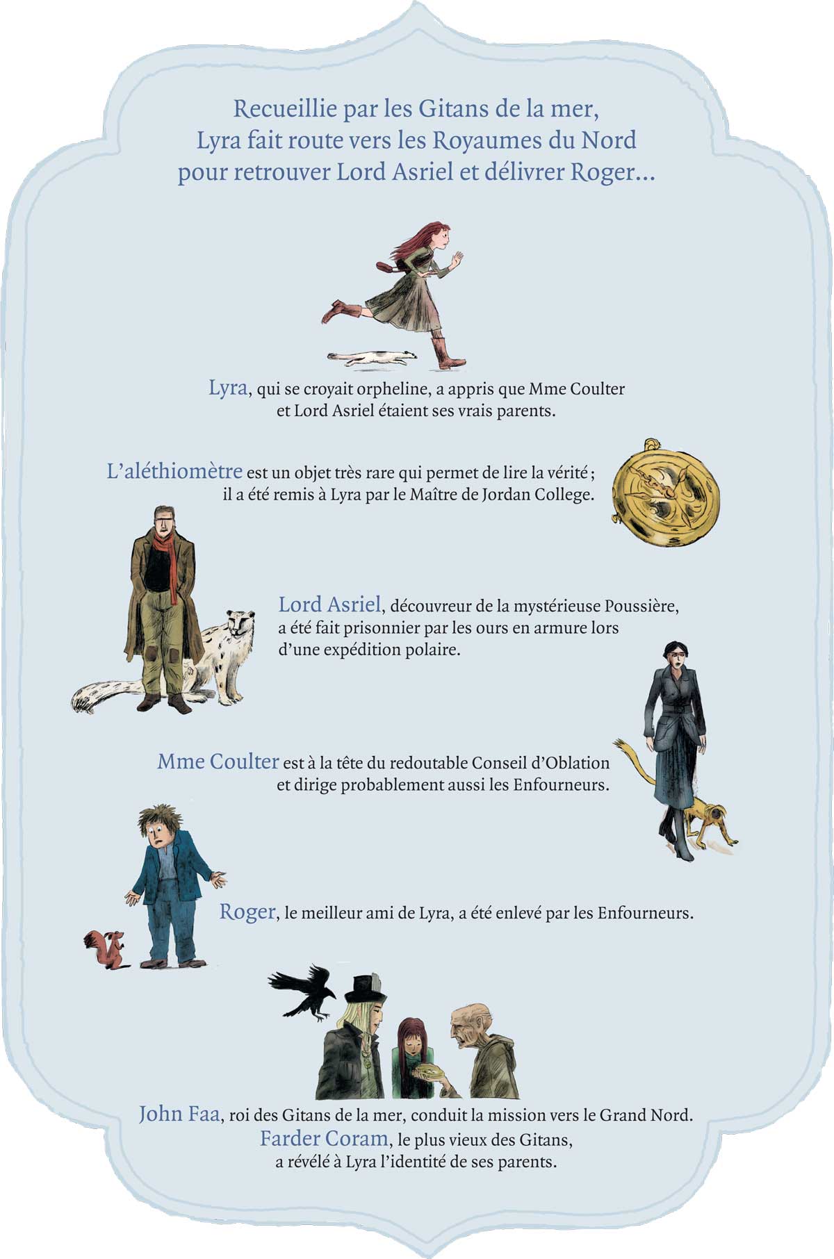 Lyra veut retrouver son père et la rencontre va être décevante. Toutefois, elle ne veut pas abandonner. On lui a dit de retrouver Lord Asriels et elle le fera. Elle doit lui parler de l’aléthiomètre. La découverte de l’identité de ces parents, ne l’a ne rend pas plus heureuse. Mais elle doit savoir pour la Poussière et ira jusqu’où elle pourra aller.