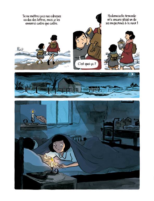 Inspirée d’une histoire vraie, Claire Fauvel a décidé de parler d’une jeune fille extraordinaire. Julia Billet dans un roman jeunesse éponyme a raconté l’histoire de sa mère, pensionnaire à la Maison de Sèvres. C’est de cela que c’est inspiré la dessinatrice pour la création de sa bd. Un vrai travail d’adaptation tout en finesse et délicatesse. Elle trouve toujours le juste milieu entre les situations très difficiles, la fuite des enfants et l’espoir d’une jeune adolescente. Jamais le récit ne tombe dans l’émotion trop facile.