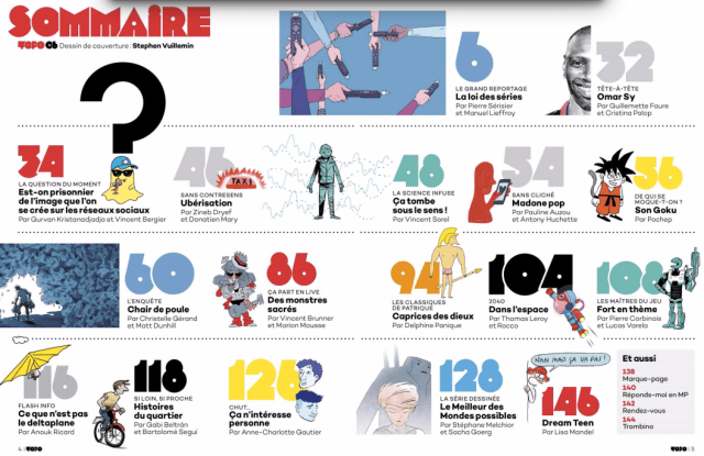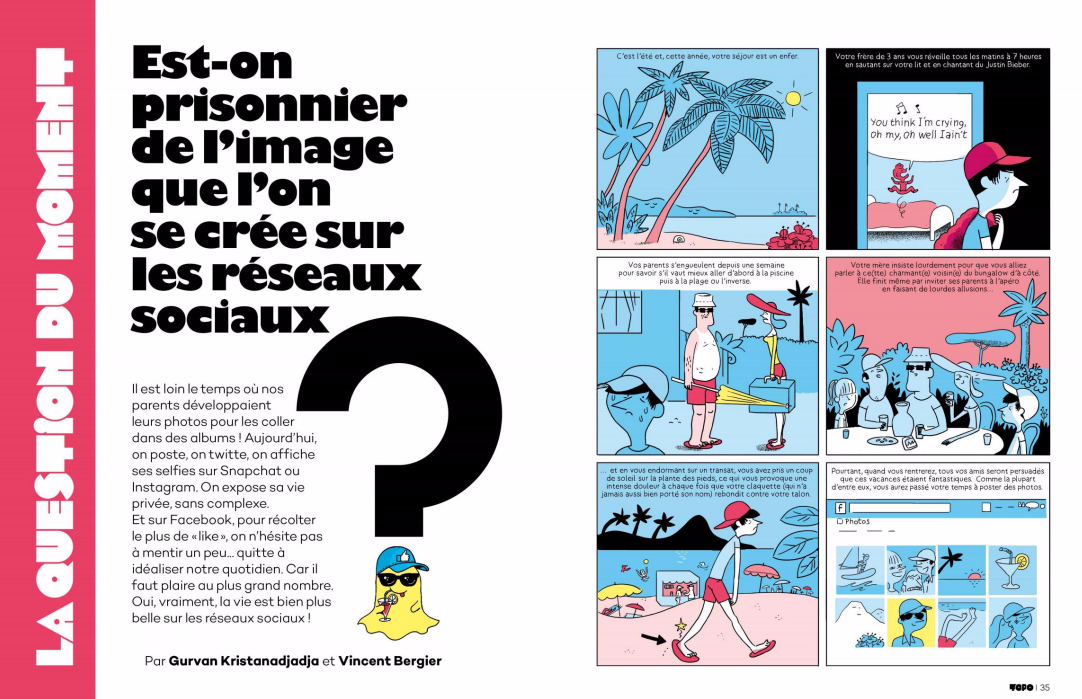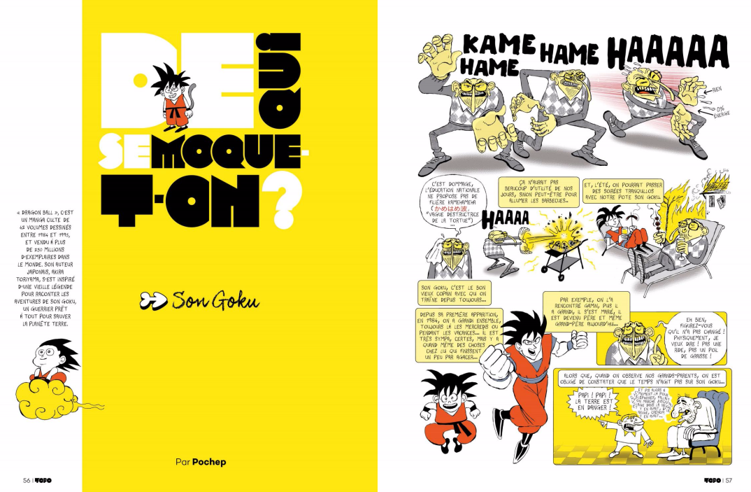 Trouver des sujets d’actualité pour les moins de 20 ans, n’est pas toujours évident. Mais avec les journalistes/dessinateurs ont le talent de trouver des thèmes qui peuvent les intéresser. Alors pour leur mettre l’eau à la bouche, trois sujets ont mis sur la couverture. Nous avons les séries télés, les réseaux sociaux et une référence à Son Goku.