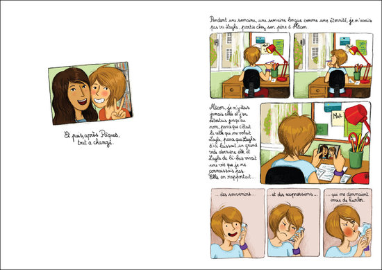 Le dessin est très jolie et correspond très bien à l’univers adolescent. En plus, les couleurs sont vives comme les sentiments et les émotions liées à leur âge. Un graphisme qui peut plaire aussi bien au jeune lecteur qui est la cible de cette bd que les adultes. J’ai trouvé la couverture vraiment très jolie et qui incite vraiment à la lecture. Tout comme le choix de faire les bords rose en écho au titre.
