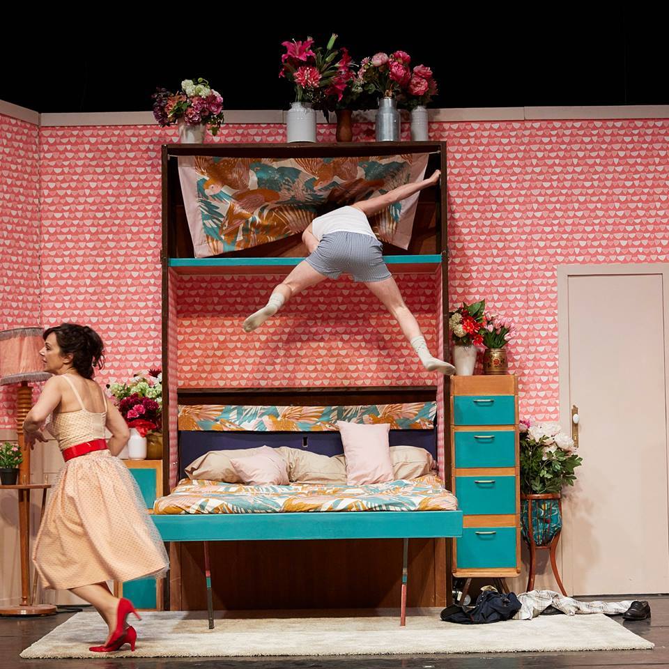 Par chance, la mise en scène de Gwen Aduh est vraiment incroyable. C’est un travail plein d’imagination qui a été fourni pour créer des choses étonnantes. Les décors se referment devant le spectateurs et sont rangés par les comédiens eux-même aidés de deux techniciens. On passe d’une chambre à étage, à la rue pour aller à la banque jusqu’au coffre-fort. Les comédiens s’infiltrent au dessus des conduits via le sol ou dessus de la scène via des conduits aérien puis descendent en rappel sur scène. Et il y a cette scène incroyable avec deux scènes en même temps cependant qui est sur deux plans différents. C’est complètement hallucinant et très drôle. Une chose que je n’avais jamais vu avant. Un vrai talent que Gwen Aduh doit continuer à cultiver car elle a fait un travail vraiment fantastique.