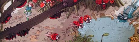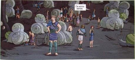 J’ai tout de suite été attirée par la couleur de la couverture. Un vert éclatant avec une jeune fille à l’air déterminé devant une coquille d’escargot. Après la lecture de la bd, on voit que toute l’histoire est racontée dans cette image. Neska fait partie d’une communauté d’humain de taille d’insectes. Cela peut rappeler « Arthur ou les minimoys » (film ou livre) ou encore le dessin animé « Epic ». Ces personnages vivent entouré d’insectes dont certains sont leur symbole. C’est le cas pour le clan du lierre qui eux aiment les escargots sous tous les formes.