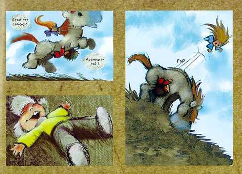 Le fond de page est marron clair. Ainsi les dessins surtout avec du bleu ressortent plus de la page. Le crayonné est vraiment étonnant et c’est un régal pour les yeux. En plus, l’histoire est toute mignonne. Trois amis, Genz Gys et Khan veulent monter sur le dos d’un cheval sauvage. Mais ce dernier ne se laisse pas faire. Genz et Khan vont tombés. Gys va rester sur le cheval qui va partir au galop. Les deux perdants vont alors aller se plaindre à leur grand-mère en disant que Gys les a laissé tomber. C’est plutôt leur égo qui en a pris un coup. Normal pour des jeunes enfants.