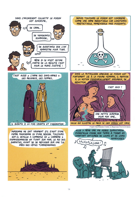 La bd débute autour d’un petit déjeuner familial dont le père (qui ressemble à l’auteur) est le principal acteur. Il va dans un premier temps parler de personnage réel ou fictif avec des histoires de poison. On débute avec Circé pour finir sur des histoires du 20ème siècle.