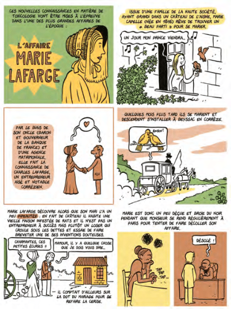 J’ai adoré la lecture de cet ouvrage qui est assez drôle et où on apprend beaucoup de choses. L’histoire du pape et des Borgia m’a tout de suite fait référence à la pièce « Lucrèce Borgia » de la Comédie Française. Ce fameux poison qui permettait d’asseoir leur pouvoir. Mais voilà, qu’un jour plein de jalousie l’époux de Lucrèce veut tuer ce jeune homme qui n’est d’autre que son fils. Une histoire troublante qui doit être à l’image d’une époque. Les poisons ont de quoi inspiré. Ne les retrouvons nous pas encore de nos jours dans moult séries et films ? La bd permet de mieux comprendre la richesse de la nature qui peut servir aussi bien à le tuer, à le torturer ou le soigner.