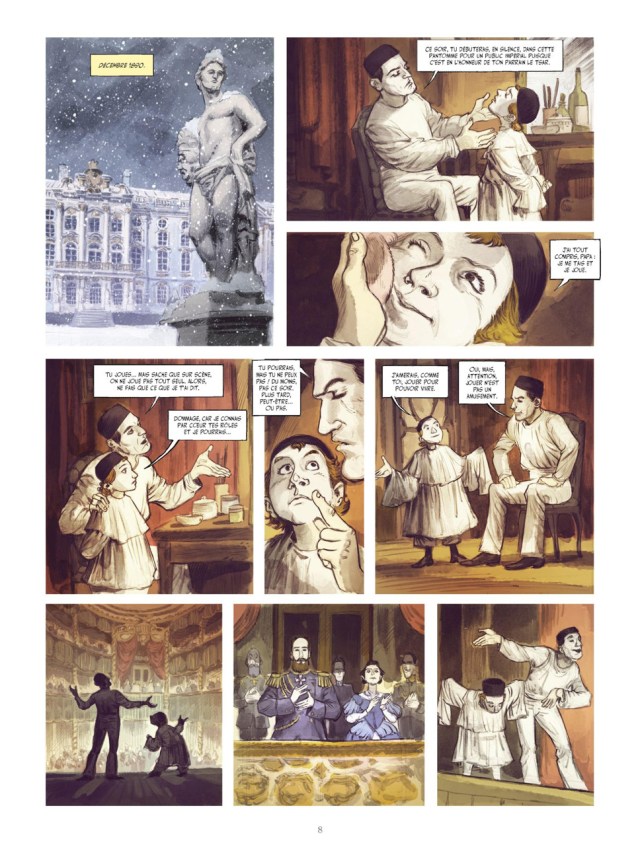 Alexandre Guitry dit Sacha Guitry a une vie trépidante qui mérite bien d’être racontée en bande dessinée. Il est né à Saint-Pétersbourg en Russie et avait comme parrain le Tsar Alexandre III. Ce n’est pas dans ce pays du froid qu’il a grandi. Mais il y est resté un petit moment avec son père. Lucien Guitry, l’avait enlevé à la garde de sa mère pour qu’il découvre sa mère patrie. Le jeune garçon a découvert autre chose, la passion du théâtre en voyant son père sur scène. Puis, il sera contraint de revenir pour retrouver sa mère et son frère, Jean et surtout pour aller à l’école.