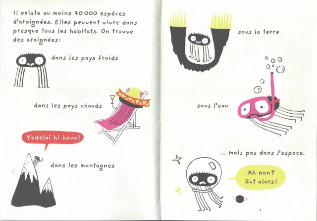 C’est toujours un plaisir de lire les petits livres d’Elise Gravel qui ne manque ni de culture et ni d’humour. En plus, il faut dire que sur la couverture, elle a l’air très sympathique la petite araignée malgré ces grandes papattes. Je n’ai pas peur d’elles mais je ne sais pas grand-chose. Le livre commence très vite avec une information capitale. Il en existe au moins 40 000 espèces dans le monde et qui vivent aussi bien sur terre, sur mer ou sous la terre. Elles peuvent être petites comme très grandes.