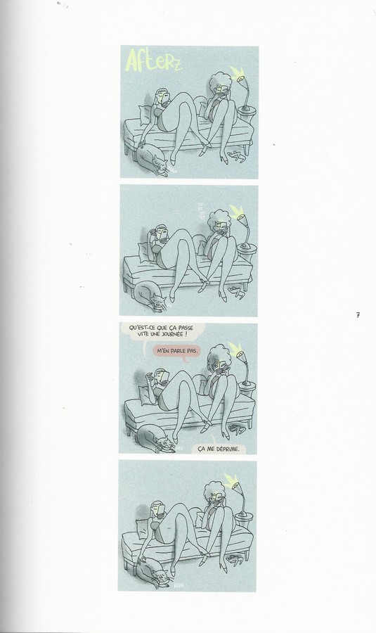 Le père de Jean et d’Henriette revient avec une nouvelle bande dessinée pour dresser le portrait d’une génération. Les strips verticaux s’enchaînent où l’on retrouve les différents personnages dans leur tristesse et leur solitude. Dans les afters, au coeur de la nuit, ils se cherchent et espèrent des lendemains meilleurs. La déception est souvent au rendez-vous. Mais parfois, la surprise de la rencontre peut se faire. Il n’y a pas que des indélicats dans ces soirées. Différents portraits sont dressés comme le surfer-styliste, l’artiste prétentieux, la styliste odieuse, le chat feignant… sans oublier les personnages principaux avec les deux copines.