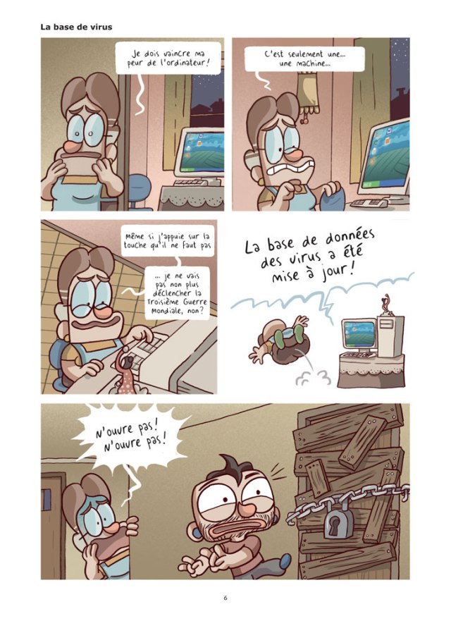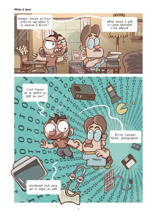 Il n’y a pas de doute que Carles Ponsi a puisé dans son quotidien pour raconter des petits moments de vie. Lorsqu’on grandit avec l’ordinateur et le numérique, c’est facile et évident. Mais lorsqu’on est d’une génération antérieur, l’apprentissage est un peu plus compliqué. Par chance, ces personnes sont souvent très motivées pour apprendre. Des choses qui nous paraissent logiques ne leur sont pas du tout. Alors bien entendu, cela créer des situations cocasses. L’auteur admet que lui aussi se fait dépasser par des enfants qui n’oublions pas apprennent maintenant le codage à l’école. Au final, très vite on vient un peu dépasser par l’évolution rapide de la technologie. Alors pourquoi ne pas en rire?