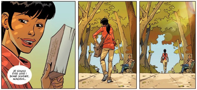 Normal car c’est un diptyque donc on ne peut pas nous donner toutes les clés tout de suite. La tension monte doucement car ce livre va devenir une obsession pour notre héroïne et les mots écrits la bouleversent. Elle veut connaître l’identité de ce lecteur qui partage. Heureusement qu’elle a ça car sa vie manque un peu d’intérêt avec un compagnon qui ne l’écoute pas et demande de l’épouser comme si il lui demandait d’acheter de la lessive. Le boulot n’est pas très passionnant non plus. Alors forcément, l’angle est braqué sur ce livre et son secret. L’action n’est pas très dense. Il n’y a pas de rebondissements inattendus. Sauf un peu à la fin pour nous inciter à lire la suite. Le dessin reste très classique avec des couleurs assez standards. Pas de prise de risque dans la mise en page. L’histoire s’étire beaucoup et donne un effet de remplissage. Les personnages auraient pu avoir plus de volume. On croirait presque le début d’une histoire érotique. C’est peut-être le cas d’ailleurs, même si j’en doute fortement. Je vais lire quand même le tome 2 pour connaître le fin mot de l’histoire.