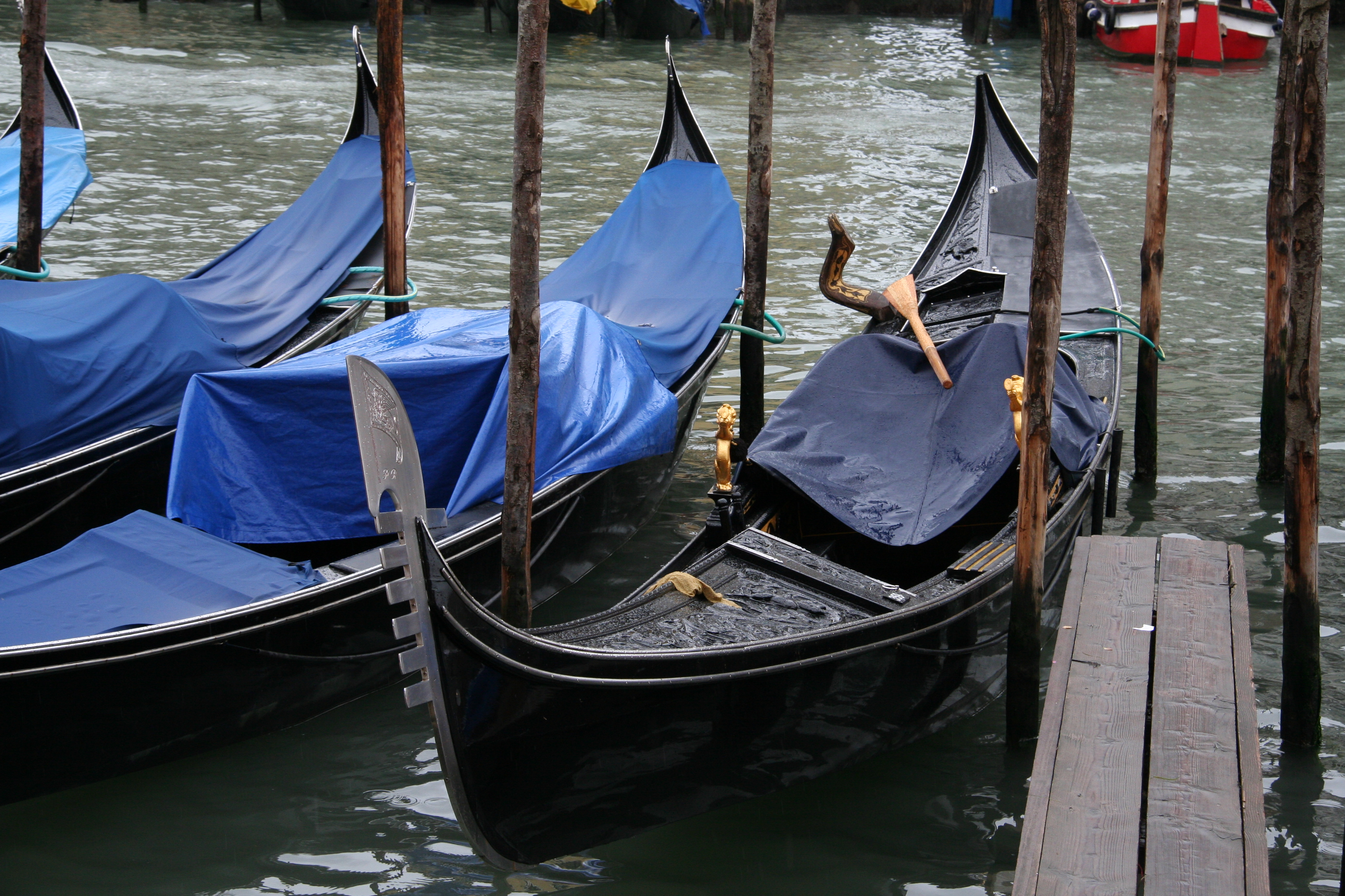 Jusqu’en 1562, la gondole était le signe extérieur de richesse des nobles. Donc on y voyait une surenchère de décoration et de luxe coloré. Mais voilà que le doge décrète suite à l’épidémie de peste, que toutes les gondoles seront noires. Rien n’a pas été changé de nos jours. Ainsi on peut juste quelques dorures discrètes à l’intérieur des gondoles.