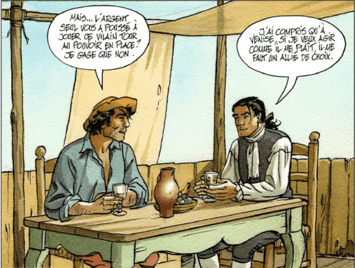 Le lecteur va être plongé au cœur de l’histoire, de l’action et de l’aventure. Ainsi on vous nous emmener dans quelques joutes d’épées, de coups bas, de traitrises, d’amour, de passion… Le scénariste a su trouver le bon rythme pour toujours faire en sorte que l’on a envie de tourner les pages. Néanmoins, il n’y a rien d’étonnant ou de surprenant, tout est simple et efficace. En effet, nous n’avons pas le temps de nous attacher aux personnages car on les voit assez peu et que leurs intentions sont clairement énoncées. On aurait pu apprécier plus connaître les conquêtes ou des personnages qui reviendront dans le tome 2.