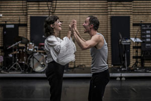 Les tragédies grecques n’étaient pas jouées à grand renfort de décors et de costumes. Sarah Llorca a décidé de s’inspirer de cela pour imaginer sa mise en scène. Le centre de la scène est recouverte d’une grande bâche et voilà le décors très minimaliste imposé. De chaque côté, un banc et le portant pour les costumes. Les comédiens ne se changent pas avec visibilité du spectateur. Les costumes restent très standards avec pantalon en jean blanc, veste en cuir, chemise blanche… Il y a juste la robe d’Aglaé qui tranche avec le reste avec une robe en velour bleu tachée de sang.