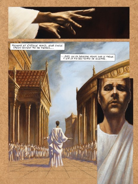 Puis, paf ces deux frères meurent dans le combat. L’un est honoré et l’autre bafoué. Son corps doit reposer hors de la ville et sans sépulture. Antigone ne peut accepter cela et rendra hommage à son frère qu’importe le prix. Un sacrifice qui n’est pas négligeable car il va lui en coûter la vie. Ce n’est pas une tragédie pour rien non plus. Le dessinateur nous épargnera toutes les scènes de violence.