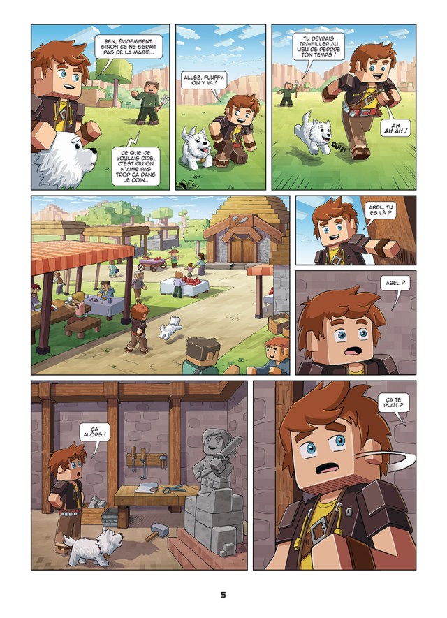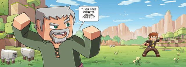 La couverture résume très bien la bd avec l’univers graphique et l’ensemble des personnages principaux. En tout cas, vous ne pourrez pas être surpris dans la lecture des carrés qui sont présents partout dans les moindres détails. Il faut dire aussi que l’histoire est très fortement inspirée de l’univers Minecraft, un célèbre jeu vidéo. C’est aussi une adaptation d’une série de romans qui a son petit succès. Et Frigiel et Fluffy sont une seule et même personne qui est très connu par des joueurs. En effet, ces vidéos, où il commente ces parties en ligne sur youtube, sont suivis par des millions de spectateurs dans le monde. Alors quoi de plus normal de le trouver à l’écriture du scénario.
