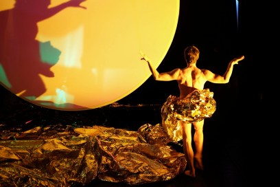 Le danseur, ici s’autorise tout. Il installe son trône au milieu du premier rang, s’entoure de belles femmes, place sur la scène et sur son fauteuil une longue traîne en couverture de survie dorée… La lumière s’y reflète en des milliers d’endroits à l’instar de la galerie des glaces. Le spectacle commence avant l’heure. L’artiste s’impose aux spectateurs et montre un côté râleur, moqueur, presque déplaisant. Le jeu du comédien incarnant le Roi-Soleil est troublant au point de se demander s’il joue un rôle ou se montre aux spectateurs au naturel… Cette ambivalence est désirée. Le comédien se présente à la fois comme danseur et roi. Le trouble est lancé sur son identité. Il se présente comme roi et danseur. Est-il touché lui aussi par un souci d’ego ? Robin Orlyn dira : “ Mon personnage de Louis XIV rentre de voyages effectués en Afrique en 2017-2018 pour aller chercher de l’or. Il a changé et veut le faire savoir. Il est de retour mais parmi des réfugiés et il n’a pas de papiers. Quand il arrive en France, la première chose qu’il cherche est un théâtre pour y partager sa nouvelle vision avec le public.” On peut voir deux ballons qui ont la forme d’un lion sur les côtés de la scène pour symboliser un territoire.