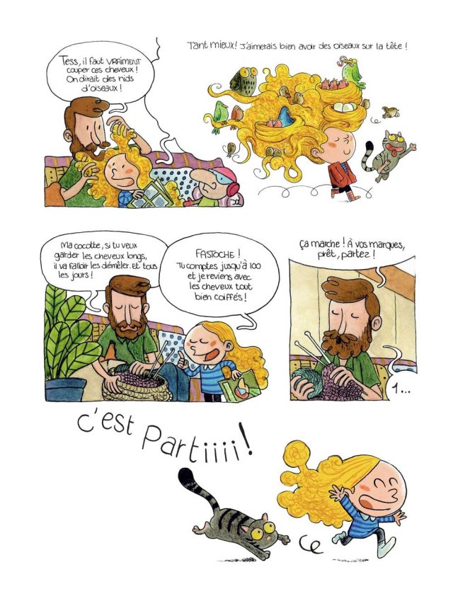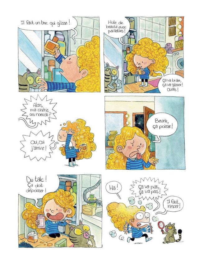 Je suis tombée sur cette album totalement au hasard. La couverture m’a tout de suite tapée dans l’oeil. Pas de doute possible, j’étais persuadée que j’allais aimé la bd. Et je n’ai pas été déçue de ma lecture. Une petite fille avec un brin d’impertinence qui a de la suite dans les idées. Et puis avec une telle tignasse les champs des possibles s’ouvrent. Quoi de plus naturelle alors qu’elle puisse les dompter pour vivre des aventures étonnantes.