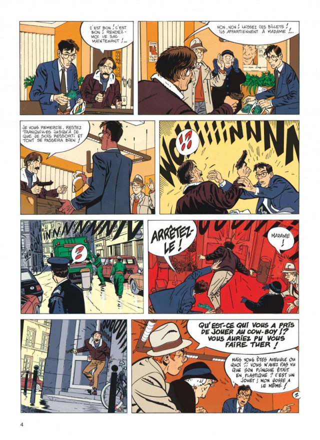 J’ai adoré la scène où le détective se fait voler son solex, perd son chapeau, se fait agresser par des loubards qui lui arrache une manche de la veste de son imper. Pour s’enfuir, il va voler le vélo du facteur pour pouvoir prendre en fraude le bus. Une vraie aventure digne du maladroit Jérôme K. Jérôme Bloche.