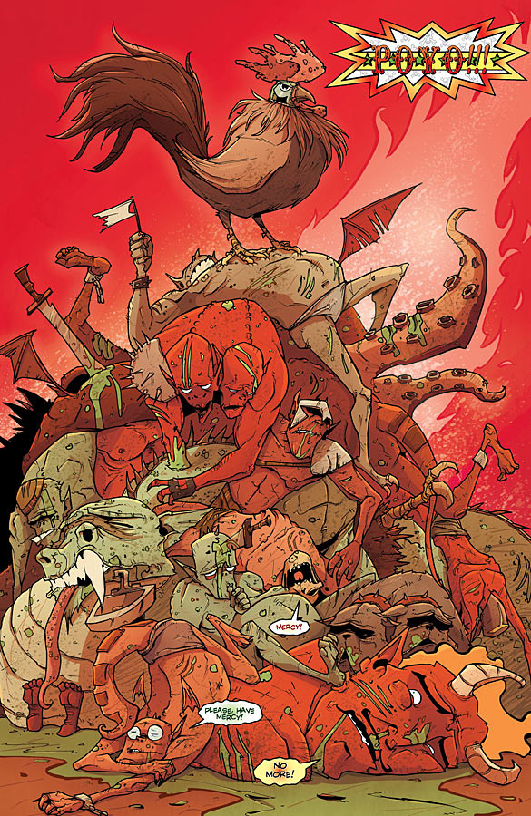Ainsi, j’ai été contente d’apprendre qu’El Poyo était de retour. Après quelques modifications qui vont couter les yeux de la tête au peuple américain, on a maintenant un agent drôlement fort. Certains ont besoin d’une armée et d’autre juste d’un coq fou surpuissant, que même le Diable craint. J’adore cet animal qui déchiquète des corps humains comme personne. Il est devenu un agent secret indispensable demandé sur toute la planète. Il va même affronter une sorte de Godzilla au Japon. C’est très drôle. Mais si la vue du sang, vous indispose, je vous invite à ne pas lire ce tome.