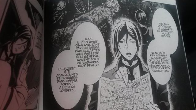 Il faut dire que ce tome commence avec une image d’Undertaker au-dessus de Ciel, déjà vu dans le tome précédent. Puis une autre image, où il se tient à table avec Ciel, Lizzie et le majordome. Puis l’histoire débute. Comment ne pas faire un lien entre ces deux dessins et ce qui va suivre ? Des choses étranges se passent et la douce Lizzie ne quitte plus ce lieu. Des cadavres considérés comme beaux commencent à être retrouvé. Mais qui a-t-il derrière ces murs ? On ponctionne du sang à tous ces volontaires sans leur dire. Je soupçonne que l’Undertaker fait le plein de sang pour ces zombies. En plus, il y a des shinigamis qui viennent mener l’enquête. Il y en a même un qui est un scientifique, Othelo. Ce qui se cache derrière tout cela risque d’être quelque chose d’assez important et sanglant. Je n’aurais pas toutes les réponses dans le tome 24 et le tome 25 n’est pas encore sorti. Il va falloir attendre le 16 mars 2018. Yana Toboso est encore arrivée à piquer ma curiosité. Je vais essayer de trouver le tome 24 quelque part.