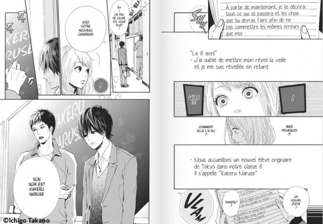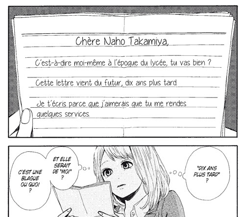 Un matin, alors qu’elle se rend au lycée, Naho reçoit une drôle de lettre… une lettre du futur ! La jeune femme qu’elle est devenue dix ans plus tard, rongée par de nombreux remords, souhaite aider celle qu’elle était autrefois à ne pas faire les mêmes erreurs qu’elle. Aussi, elle a décrit, dans un long courrier, les évènements qui vont se dérouler dans la vie de Naho lors des prochains mois, lui indiquant même comment elle doit se comporter. Mais Naho, a bien du mal à y croire, à cette histoire… Et de toute façon, elle manque bien trop d’assurance en elle pour suivre certaines directives indiquées dans ce curieux courrier. Pour le moment, la seule chose dont elle est sûre, c’est que Kakeru, le nouvel élève de la classe, ne la laisse pas indifférent…