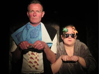 Le court texte s’accompagne d’une mise en scène très visuelle avec d’un côté un grand rideau vert aux motifs répétitifs et de l’autre côté une table avec des chaises d’enfants. Les costumes et les poses m’ont tout de suite fait penser à de la photographie, des films en noir en blanc pour les côtés statiques ou l’étrangeté dans les films de David Lynch. J’’avais envie de prendre quelques clichés. Comme par exemple a scène où Quentin et Baby font l’amour sur la table basse ou le couple avec une femme assise avec un homme debout avec une main sur l’épaule avec le rideau en fond. Quelques images restent dans la mémoire et me permet de garder toute mon attention sur scène.