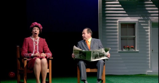 Samedi soir, j’avais rendez-vous un peu particulier à l’Athénée. J’allais rencontrer « La Cantatrice chauve ». Une dame qui fête ces 67 ans de scène. Pour l’occasion le théâtre a proposé le spectacle avec la mise en scène crée par Jean-Luc Lagarce en 1991 avec les acteurs d’origine. Une mise en scène très particulière qui en surprendra plus d’un. D’ailleurs se sont les décors d’origine que l’on découvre sur le plateau. Quand la lumière éclaire la scène on voit une charmante petite maison avec un grand jardin vert, une barrière, la séparant de la rue, une balançoire, un ballon rouge, un tuyau d’arrosage et deux chaises. On pourrait presque se croire dans l’univers visuel de Jacques Tati. Les costumes sont eux aussi haut en couleurs. Les tailleurs identiques des femmes n’ont rien à envier à ceux de la reine d’Angleterre. Les hommes portent le même costume avec chaussures grises, cravate rouge sur une chemise jaune. La disparité morphologique renforce l’ensemble des dysfonctionnements des couples.