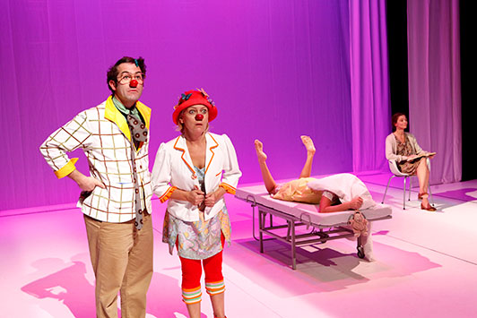 Depuis plus de 25 ans, l’association Le Rire Médecin envoie près de 100 clowns dans des services pédiatriques dans des hôpitaux. Cinq d’entre eux ont décidé de créer un spectacle pour parler de leur travail et des relations qu’ils créent avec les patients. Ainsi Bruno Gare, Stéphanie Liesenfeld, Margot Mc Laughlin, Doriane Moretus et Vincent Pensuet laissent leurs vêtements du quotidien au vestiaire pour se vêtir de leur tenu de travaille. Perruques, nez rouge, chaussures ou pantalons trop grands, lunettes sans verre… sans oublier un peu de maquillage et ils sont prêts à affronter l’univers blanc de l’hôpital.