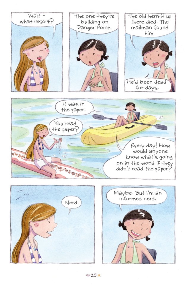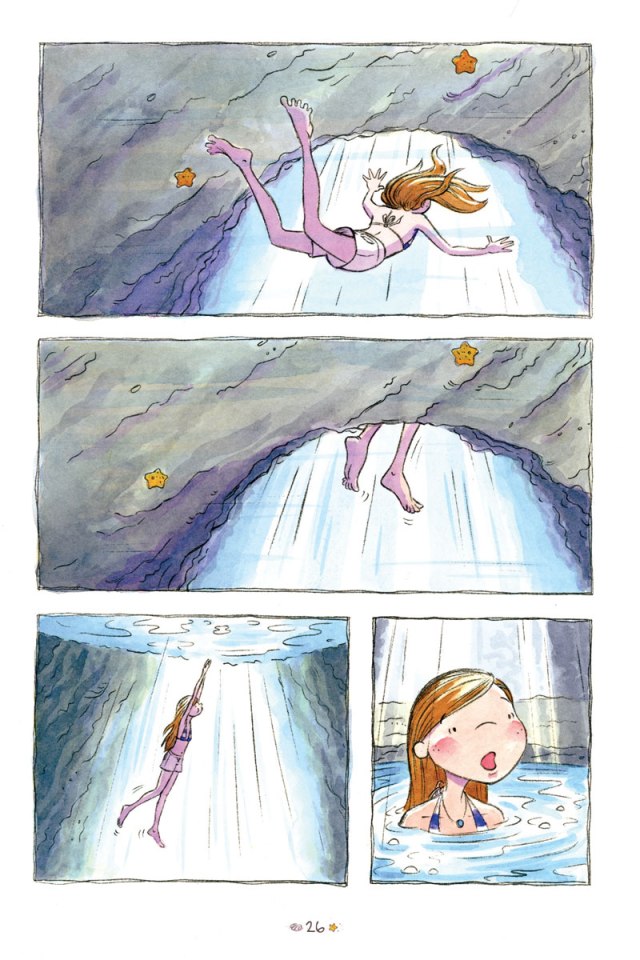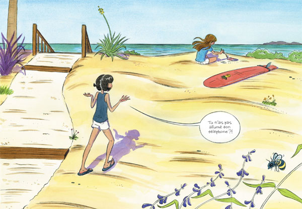 Lorsqu’on voit la couverture avec les deux jeunes filles et une planche de surf, on ne se doute pas que de la magie va venir faire son entrée. Kim Dwinell a été sauveteuse et est en plus une passionnée de surf. Voilà des choses qui ont dû contribuer à la construction de son histoire. Et aussi à la vraisemblance du récit avec des adolescentes soumises à de nombreuses interrogations sur leur physique, leur identité, le rapport aux garçons, le regard des autres… Les notions d’amitié, de famille, de préservation de la nature sont très présentes. Ainsi, on montre les éléments qui permettent de construire des futurs adultes tout en les impliquant dans leur environnement.