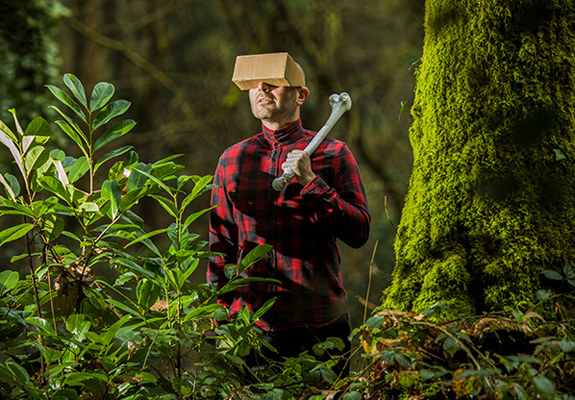 Seul sur scène, qui a une apparence du retro du futur, il va nous faire voyager dans un improbable espace-temps. Qui est cette personne ? un humain ? un homme bionic ? un robot ? La réponse n’est pas nécessaire. Pas besoin de parole, quelques sons improbables qui sortent d’ici ou là accompagnent l’étrange mise en scène avec les panneaux lumineux qui l’entoure. Pas besoin non plus de dernières technologies, juste de la bidouille. Et une bidouille à l’épreuve de l’imagination. On découvre un casque immersif avec quelques morceaux de plastique aimantés, des lunettes de réalité virtuelle avec des cartons prédécoupés ou un fémur dévissable arme à feu. Tout s’assemble et l’effet magique du produit fini se crée. Un cerveau avec un câble USB se branche et nous plonge ailleurs. Il nous explique même ce qui nous entoure avec la voie neutre telle celle du GPS. L’objet est magnifique, d’ailleurs, il a été choisi comme image pour l’affiche. En plus, l’objet s’ouvre et se délite. Un vrai régal de petits détails au combien recherchés et inventifs.