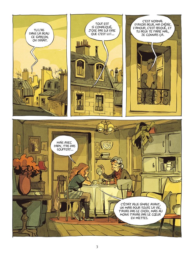 Avant de nous plonger au cœur de la seconde guerre mondiale à Paris, nous assistons à un échange entre une grand-mère et sa petite fille à notre époque. Le sujet est la peine de cœur et le coup de foudre. « C’était plus simple avant, c’était un mari pour toute la vie, t’avais pas le choix mais au moins t’avais pas le cœur en miettes […] T’as de la chance de pas connaître cette galère-là. T’es jamais tombée amoureuse. » La grand-mère a vécu longtemps avec un homme qu’elle n’aimait pas mais c’était une autre époque. On pouvait aimer qu’un homme toute sa vie même si l’on ne l’avait pas choisi. Maintenant on peut suivre plus librement son cœur. Ce partage est une occasion de se souvenir d’un moment d’amour fou sans limite.