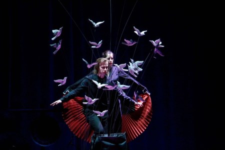 Entre ces paroles, la musique de Michaël Levinas contribue à créer l’univers au combien particulier pour donner vie à ces oiseaux. Sur scène, des musiciens aux instruments les plus diverses et étonnants composent l’univers sonore. On voit harpe, contrebasse, flutes, cloches, cymbales, tambours… de l’ensemble 2le2ml.Ils jouent en direct sur le plateau une musique plutôt électronique. Mais la musique que nous entendons est majoritairement pré-enregistrée. Elle souligne une phase de mutation du projet de voyage. Une occasion pour les musiciens alors de se vêtir d’un léger costume et de se transformer en oiseau. Ils deviennent ainsi des volatiles parmi ceux de papier présents en fond de scène.