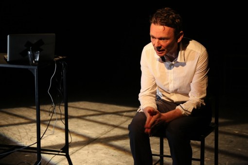 L’émotion est au coeur du récit qui parle d’un sujet très sensible : la pédophilie. L’histoire est autour d’un adulte qui prend conscience qu’enfant il a été abusé par son oncle. Impossible de ne pas être touché par cette lente découverte de son passé traumatisant. Le texte écrit par Denis Lachaud se veut troublant dans le dévoilement d’un passé volontairement oublié. Quatre ans de souvenirs oublié et le refoulement de son identité homosexuelle. Un point appuyer par la répétition excessive de l’expression : « je vais t’enculer ». Un malaise s’installe. La mise en scène très maligne de Pierre Notte permet à Benoit Giros d’interpréter tous les personnages au plus proche du ressenti. Un jeu de lumière par-ci avec projection d’une fenêtre et un jeu de lumière directe par-là pour la scène chez le psychologue. Les déplacements sont minutés, calculés avec grande précision. Alors le décor reste sobre avec une table, un ordinateur, des verres d’eau et quelques chaises. Juste le nécessaire. L’important se sont les mots choisis avec exactitude qui petit à petit prennent plus de sens pour mieux nous percuter.