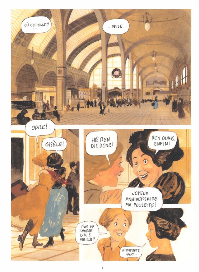 Tout débute avec l’arrivée d’Odile à la gare d’Orsay pour l’exposition universelle de 1900. Une gare ouverte exprès pour l’occasion, à deux pas du pont Alexandre III, du Petit Palais et du Grand Palais. Une transition maligne pour nous plonger dans ce lieu devenu en 1986 un musée à part entière. Derrière les murs se cachent des peintures où le visiteur actuel peut découvrir « La charmeuse de serpents » du Douanier Rousseau. On est libre d’apprécier ou pas. Puis en continuant notre déambulation, on se perd dans le temps.