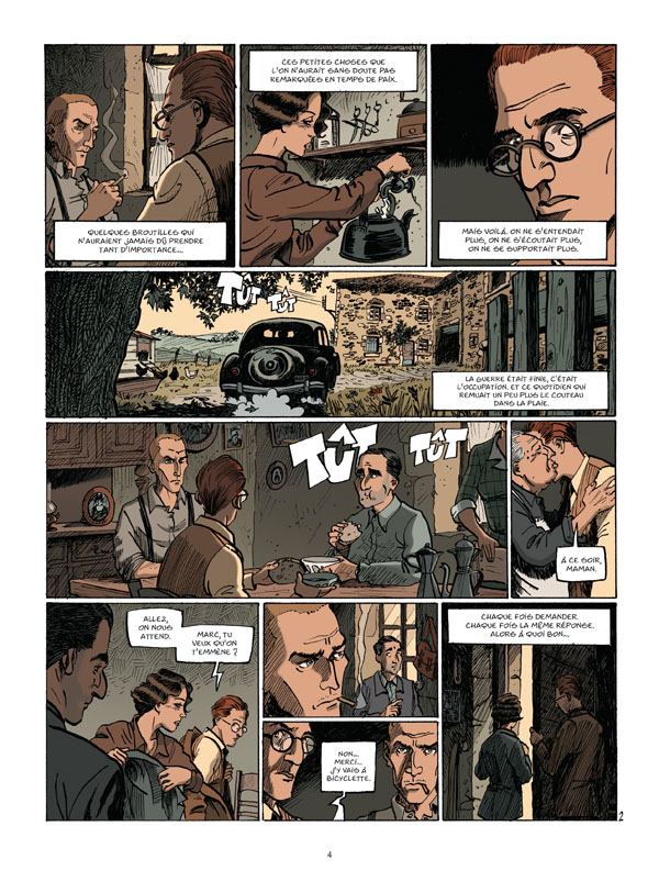 C’est une photographie de Robert Capa, qui a incité Sylvain Ricard et Arnü West à écrire cet album.C’était en 1944, la France se libérait… En approchant au plus près l’intimité d’une famille ordinaire en proie à tous les déchirements dus aux horreurs de cette époque, ce récit sans concessions met en lumière toute la complexité des choix humains. Une subtile mise en garde contre le confort facile de la simplification.Mai 1944, aux environs de Lyon. Dans une grande ferme, cohabite toute une famille. Delphine vit dans le souvenir de son mari, mort pour la France en 1918, elle le vénère autant que le Maréchal, Philippe Pétain, le vainqueur de Verdun, le sauveur de la France. Elle règne en matriarche sur ses trois premiers fils et leurs épouses, son quatrième, lui, a rejoint la résistance et est entré dans la clandestinité. La guerre, il faut bien s’en accommoder, s’en arranger, alors on se débrouille, on fait ses petites affaires… Faut bien vivre. Et cette guerre a aussi créé des abîmes d’incompréhension entre les membres de la famille: on ne s’écoute plus, d’ailleurs, on ne se supporte plus. Les Alliés arrivent et avec eux, la fin de l’Occupation. Alors viendra le temps de l’épuration, celui aussi des règlements de compte, des basses vengeances et de la conscience tranquille.