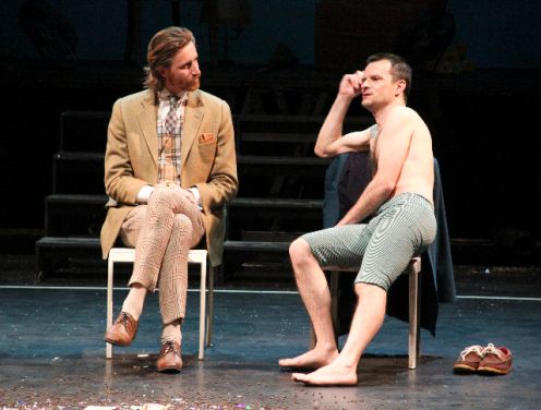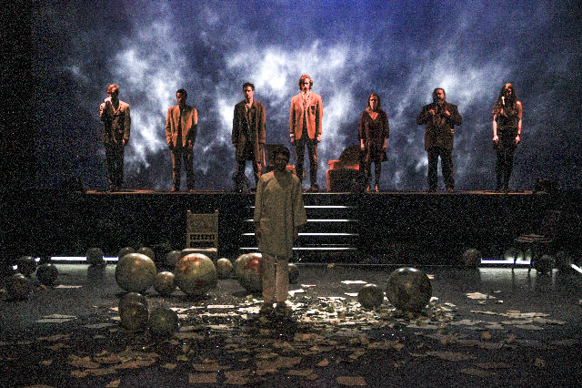 Il fallait une mise en scène à la hauteur du texte adapté. Et quand on arrive dans la salle, on constate ce partie pris. Le spectateur a la possibilité soit d’aller dans la salle ou soit d’aller s’asseoir sur scène. Pour ma part, j’ai décidé d’aller sur scène dans l’espace qui mettait prévu. Igor Mendjisky n’a pas choisi au hasard cette disposition. La participation du public sera requise par moment. Et par moment, son apparition sur scène pourra poser des questions d’ordre moral. Mais avant de s’interroger, on se laisse porter par l’histoire d’une part qui mélange trois récits. Et d’autre part, on se laisse guider par l’excellent jeu des comédiens qui à 8 interprètent 18 personnages. Même si les rôles féminins sont moins présents et moins flamboyants, on ne peut qu’applaudir avec force et reconnaissance le travail des artistes présents qui se donnent corps et âme. Et il vaut mieux dans une histoire qui parle du Christ, de Ponce Pilate et du Diable. En un clin d’œil, ils changent un détail de leur costume, prennent un accessoire, voir se décoiffent légèrement et ils sont autres. Interdiction de se tromper car tout se fait sous l’œil scrutateur du spectateur qui les entoure. Par chance, tout est maîtrisé avec la précision d’un horloger suisse. Même lorsqu’ils parlent en russe, en hébreu ou en grec, l’accent sonne juste et vrai.