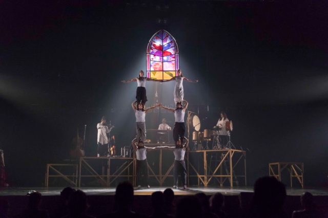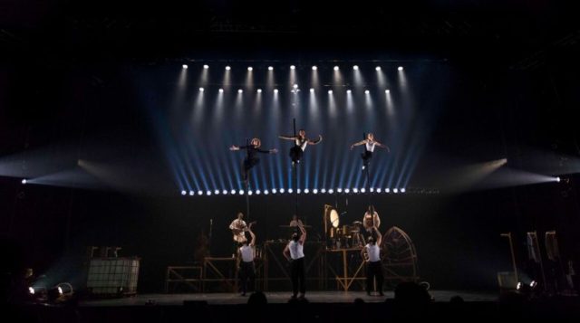 Par chance, le reste de la compagnie est à 100% et permet à la magie de prendre vie. La plupart des numéros sont inédits et assez pétillants de génie comme celui de derviches tourneurs en habit de tricot. La musique se joue en live par Josianne Laporte, David Simard et Guillaume Turcotte. Ils mettent une dose de fantaisie très appréciable. Les hommes sont presque tous barbus avec un physique assez impressionnant. Normal vu tout ce qu’ils portent et propulsent. On découvre des acrobaties peu standards et le reste nous fait ouvrir grand les yeux. Magnifique travail de Nikolas Pulka qui montre son talent en souplesse, sourire et humour quelque soit l’agrès. Tout comme Jean-Philippe Cuerrier et Antoine de Carabinier Lépine qui font des portés de précision, des sauts de hautes voltiges impressionnants et des jongleries avec des encensoirs à couper le souffle.