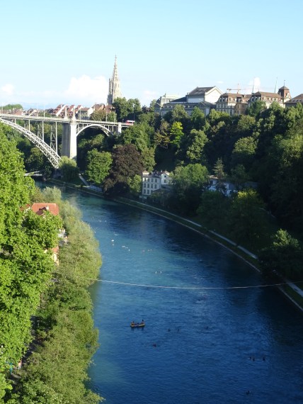 Petit détail sur la photo qui mérite une petite histoire. L’Aar est un cour d’eau à Berne en Suisse. Après le travail, certaines personnes se mettent en maillot de bain, rangent leurs vêtements dans un sac qui se ferme hermétiquement et hop, ils sautent dans l’eau. Le courant les emporte au loin où ils sortent tranquillement sur des bords aménagés. Ils se sèchent et reprennent leur vie tranquillement.