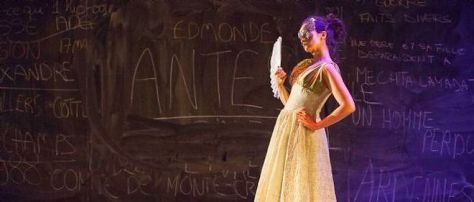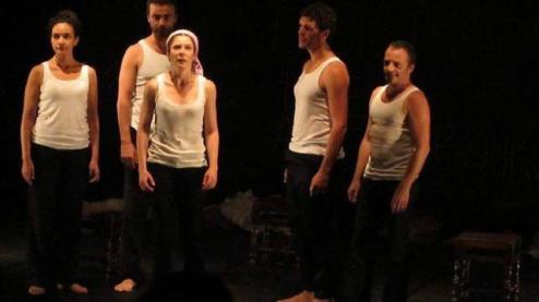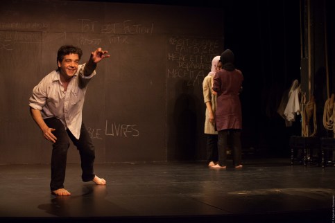 Une fois la salle remplie, le noir gagne doucement le public et les comédiens entrent en scène. Ils sont 5. Deux femmes et trois hommes. Ils portent tous un jean et un marcel blanc. Ils face à nous. Puis un comédien prend la parole et nous pose la question « Qu’est-ce qu’une histoire ? ». Calmement, il nous en donne une définition que les artistes qui l’entourent complètes progressivement. Chacun change de place et le récit prend doucement vie sous nos yeux. Le tout dans un décor très sommaire avec un mur pour écrire à la craie, cinq tabourets noirs et un portant avec des costumes. Mais juste cela va largement suffire à nous guider dans une histoire incroyable.