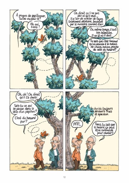 Certains à l’évocation du mot mathématique fuient à toute jambe. Le directeur de collection, Daniel Casenave, va dans l’introduction avec simplicité présenter les deux auteurs et l’objectif de l’ouvrage. Nous voilà rassuré. On peut entamer la lecture de la bd qui se présente sous forme d’échanges entre le dessinateur et le mathématicien. Un compagnon, un lépidoptère, non dénué d’humour, va les accompagner dans leur drôle d’aventure. Ils vont se lancer des défis avec des dés ou une boîte vide coupée en deux. L’ouvrage se veut pédagogique mais j’avoue n’avoir pas vraiment saisi tous les théories ou théorème comme celui du central limite ou du chaos.