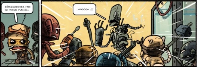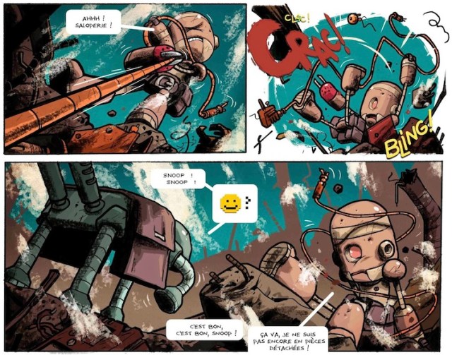 Le début d’une aventure qui se dévore d’une traite. Car je les ai adoré tout de suite ces trois petits robots plus le petit humain. L’homme n’existe plus sur Terre ou du moins on ne le sait pas. L’information n’a pas été transmisse aux robots dans l’Histoire de leur espèce. Que d’intrigues, de mystères, de rebondissements… Aurélien Decoudray tape fort pour un premier tome très complet et construit avec précision. Steve Baker au dessin joue avec beaucoup de codes graphiques et n’hésite pas à glisser quelques clins d’œil comme Astro, Bender, Captain America… Ils en profitent pour parler de la société de consommation, du formatage des esprits, de l’intelligence artificielle… Sans oublier une bonne d’humour ce qui fait que les pages se tournent le sourire aux lèvres. Une seule envie se fait sentir, continuer de découvrir ce triptyque.