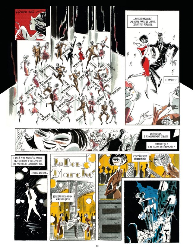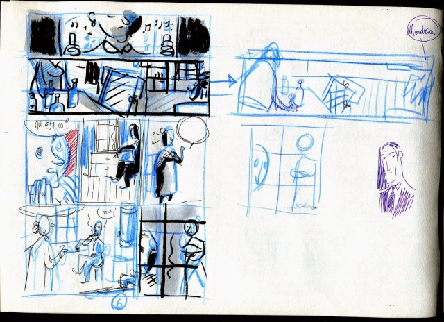 Et aussi la salle de danse où le rythme est présent dans le mouvement des personnages. Francine tranche avec sa robe rouge qui l’a sublime. Cette teinte fait référence aux toiles du maître de l’abstraction. Un petit clin d’oeil au fait que Mondrian avait une horreur du vert. Même si l’histoire tourne court trop vite. Un carnet de croquis illustre la mise en place de l’album et qui prend presque autant de place que l’histoire elle-même.