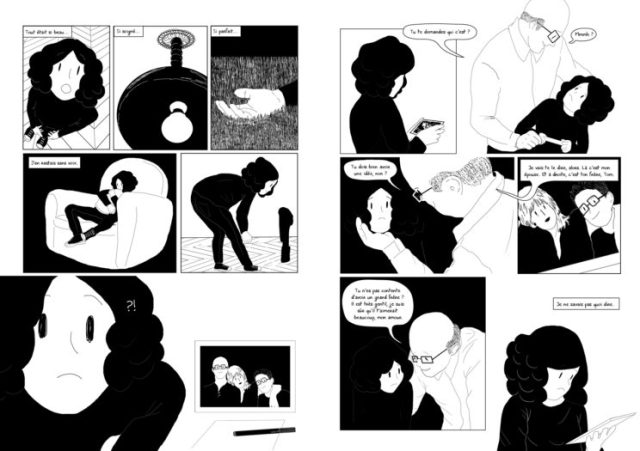 Le titre de la bande dessinée sonne très juste par rapport au récit. Le choix du graphisme pour la couverture trouve tout son sens. Un père, petit et souriant et dans son ombre, géante, sa fille illégitime. Une fille en quête de sens sur son identité, sur sa naissance. Marie-Anne Mohanna laisse volontaire des zones d’ombre sur la rencontre de ces parents, la vie de la seconde famille, la non-rencontre avec son demi-frère… Elle s’oriente vers les émotions, l’évolution de caractère de Léa et surtout son lien avec son père qu’elle aime éperdument. Une tendresse qui s’affiche par le partage de moments simples. Pour montrer ce lien la dessinatrice a choisi de travailler uniquement en noir et blanc. L’illustration se situe entre la représentation « grossière » et l’approximation des gens et des décors. Comme si il y avait une dualité entre l’enfant qui gribouille et la femme qui dessine. On ne doute pas que l’émotion est au bout crayon.